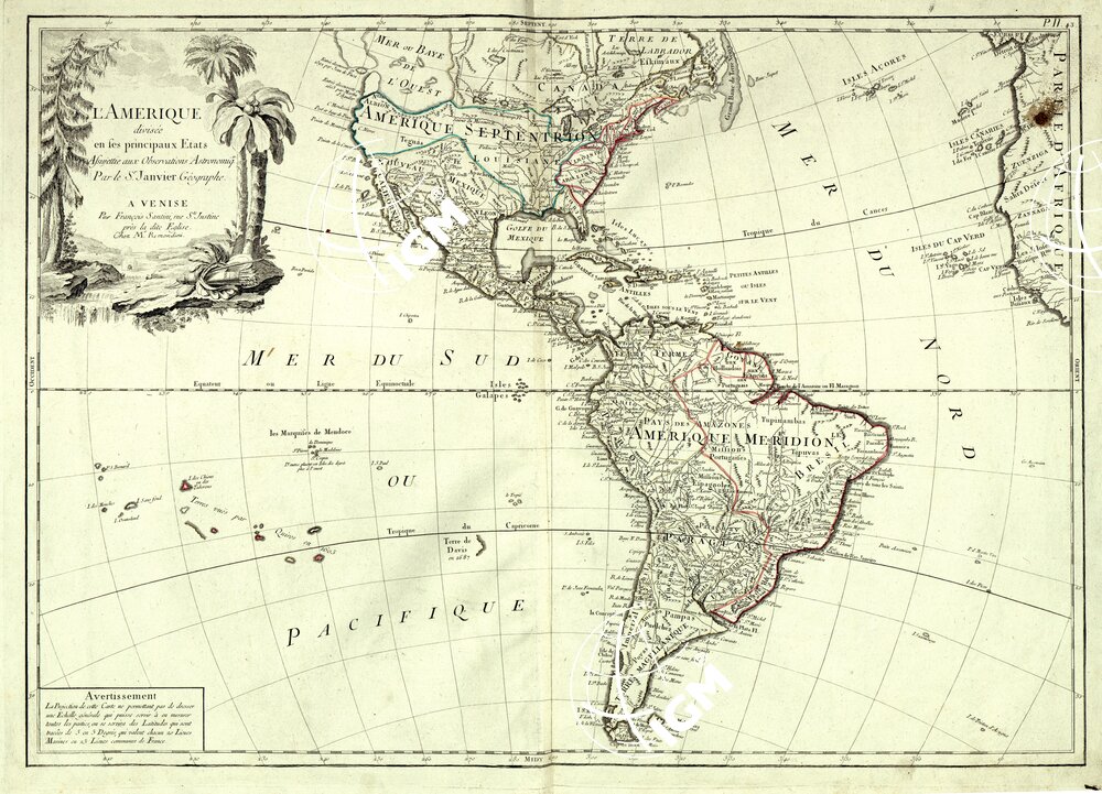 CARTE DI GEOGRAFIA-ATLANTE DEL SANTINI – Foglio 14- L’AMERIQUE DIVISEE EN SES PRINCIPAUX ETATS ASSUJETTIE AUX OBSERVATIONS ASTRONOMIQUES PAR LE S.r. JANVIER GEOGRAPHE. A VENISE PAR FRANCOIS SANTINI RUE S.te JUSTINE PRES LA DITE EGLISE CHEZ Mr. REMONDINI.