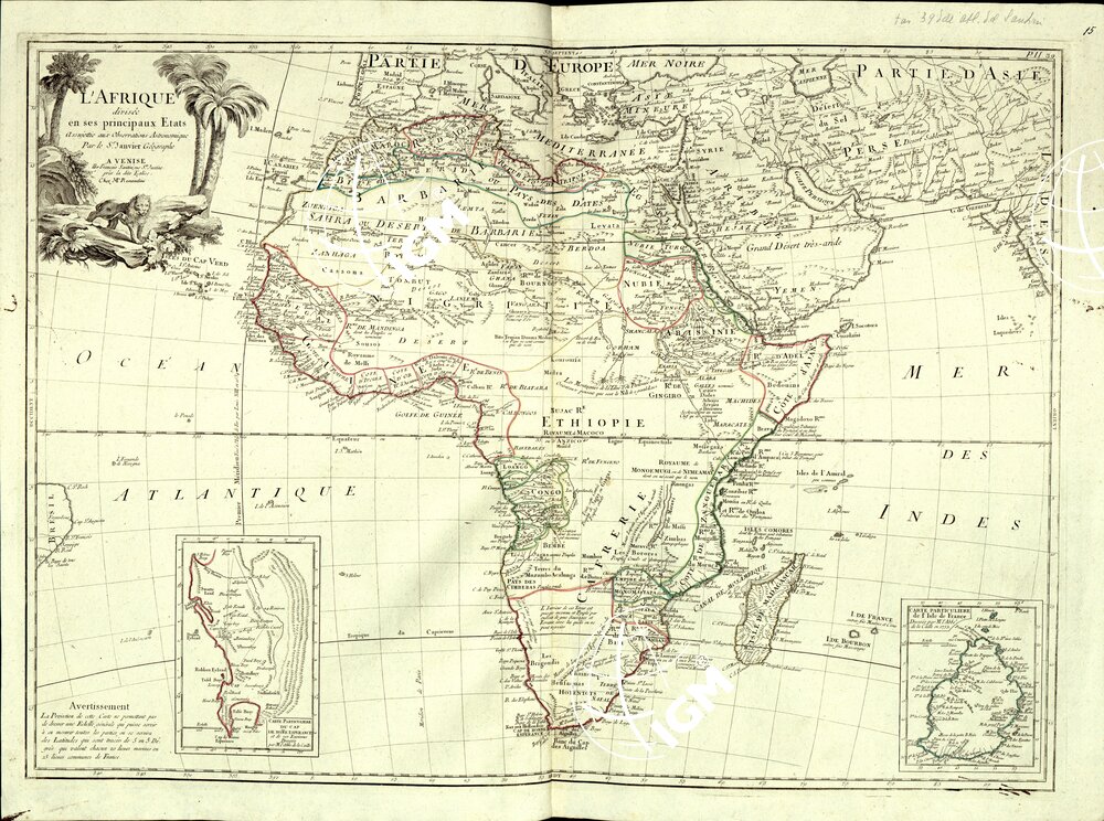CARTE DI GEOGRAFIA-ATLANTE DEL SANTINI – Foglio 15- L’AFRICA DIVISEE EN SES PRINCIPAUX ETATS ASSUJETTIE AUX OBSERVATIONS ASTRONOMIQUES PAR LE S.r. JANVIER GEOGRAPHE. A VENISE PAR FRANCOIS SANTINI RUE S.te JUSTINE PRES LA DITE EGLISE CHEZ Mr. REMONDINI.