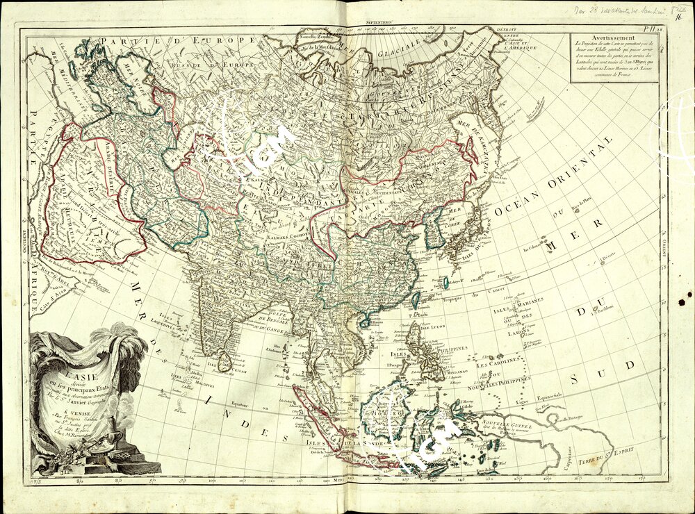 CARTE DI GEOGRAFIA-ATLANTE DEL SANTINI – Foglio 16- L’ASIE DIVISEE EN SES PRINCIPAUX ETATS ASSUJETTIE AUX OBSERVATIONS ASTRONOMIWQUES PAR LE S.r. JANVIER GEOGRAPHE. A VENISE PAR FRANCOIS SANTINI RUE S.te JUSTINE PRES LA DITE EGLISE CHEZ Mr. REMONDINI.
