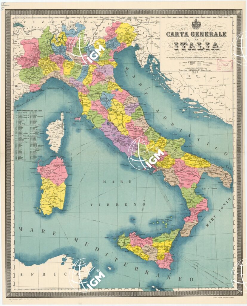 CARTA GENERALE D’ITALIA CON INDICAZIONI DEI CAPOLUOGHI DI PROVINCIA, DI CIRCONDARIO E DI PRETURA, DELLE STRADE FERRATE IN ESERCIZIO ED IN COSTRUZIONE E DELLE LINEE DI NAVIGAZIONE, ORDINATE PER LA LEGGE DEL 15 LUGLIO 1877