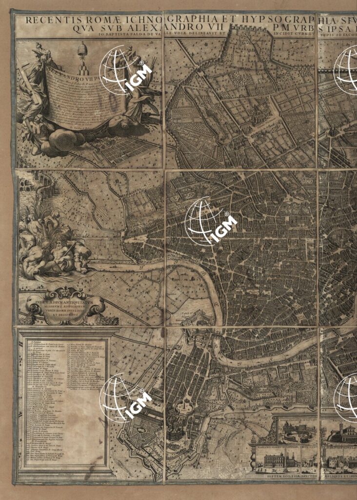 RECENTIS ROMAE ICHNOGRAPHIA ET HYPSOGRAFIA SIVE PLANTA ET FACIES AD MAGNIFICENTIAM QUA SUB ALESANDRO VII P.M. URBIS IPSA DIRECTA EXCULTA ET DECORATA EST IO BAPTISTA FALDA DE VALLE UDIAE ET INCIDIT CURA ET TYOIS IO IACOBI DE RUBEIS…