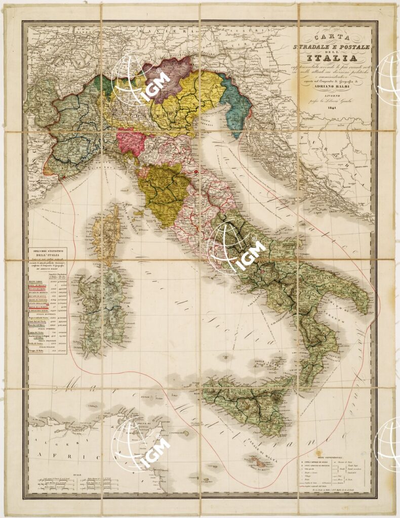 CARTA STRADALE E POSTALE DELL’ITALIA RAPPRESENTATA SECONDO LE PIU’ RECENTI NOTIZIE NELLE ATTUALI SUE DIVISIONI POLITICHE E AMMINISTRATIVE ESPOSTE NEL COMPENDIO DI GEOGRAFIA DI ADRIANO BALBI. LIVORNO, PRESSO LA LIBRERIA GAMBO.