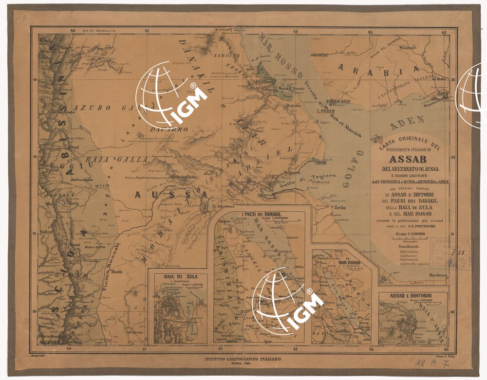 CARTA ORIGINALE DEL POSSIEDIMENTO ITALIANO DI ASSAB DEL SULTANATO DI AUSSA E REGIONI LIMITROFE DELL’ABISSINIA E SCIOA A BERBERA E ADEN CON SPECIALI CARTINE DI ASSAB E DINTORNI NEI PAESI DEI DANAKIL DELLA BAIA DI ZULA E DEL MAR ROSSO.