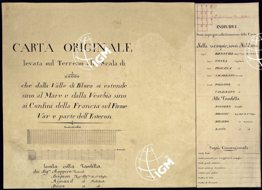 CARTA ORIGINALE LEVATA SUL TERRENO ALLA SCALA 1:20 000 CHE DALLA VALLE DI BLORA SI ESTENDE FINO AL MARE E DALLA VESUBIA SINO AI CONFINI DELLA FRANCIA SUL FIUME VAR E PARTE DELL’ESTERON – FOGLIO 10 – TITOLO E SEGNI CONVENZIONALI.