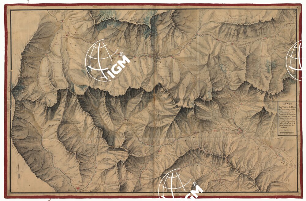 CARTE DES VALLEES DE DOIRE, DE CHENISCIA, D’OULZ DE BARDONNECHE, DE CESANE, ET DE PRAGELA EN PIEMONT DES VALLEES DE BESSAN ET DE MAURIENNE EN SAVOYE ET DES VALLEES DES PRES ET DE MONESTIER DANS LE DAUPHINE’ DESSINE PAR LE TOPOGRAPH LOUIS BRAMBILLA.