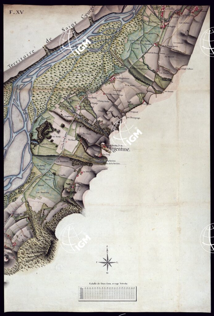 MODELE QUI SERT POUR L’UNION DES FEUILLES, QUI COMPOSENT LA CARTE DE LA GRANDE ROUTE DEPUIS CHAMBERY JUSQU’A S. JEAN DE MAURIENNE LEVEE SUR LIEUX DANS SUR LIEUX DANS ANNES 1781 ET 1782 PAR MARCHETTI INGENIUR TOPOGRAPHE DE S. M. – FOGLIO XV.