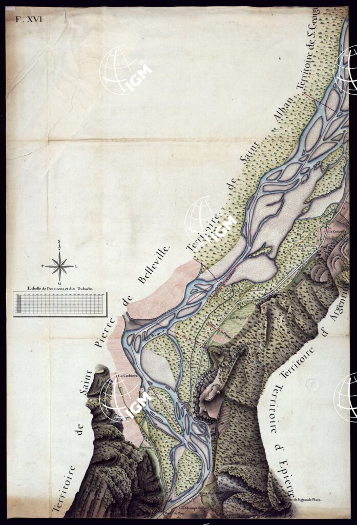 MODELE QUI SERT POUR L’UNION DES FEUILLES, QUI COMPOSENT LA CARTE DE LA GRANDE ROUTE DEPUIS CHAMBERY JUSQU’A S. JEAN DE MAURIENNE LEVEE SUR LIEUX DANS SUR LIEUX DANS ANNES 1781 ET 1782 PAR MARCHETTI INGENIUR TOPOGRAPHE DE S. M. – FOGLIO XVI.