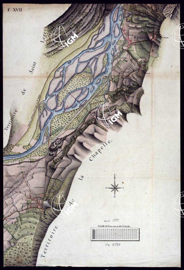 MODELE QUI SERT POUR L’UNION DES FEUILLES, QUI COMPOSENT LA CARTE DE LA GRANDE ROUTE DEPUIS CHAMBERY JUSQU’A S. JEAN DE MAURIENNE LEVEE SUR LIEUX DANS SUR LIEUX DANS ANNES 1781 ET 1782 PAR MARCHETTI INGENIUR TOPOGRAPHE DE S. M. – FOGLIO XVII.