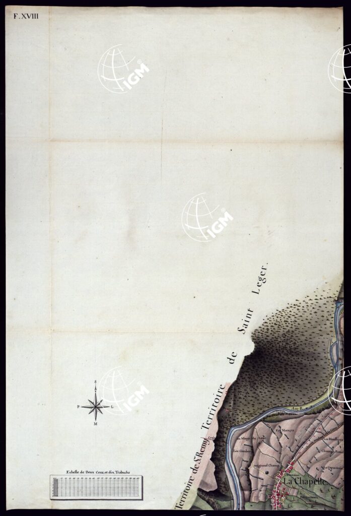 MODELE QUI SERT POUR L’UNION DES FEUILLES, QUI COMPOSENT LA CARTE DE LA GRANDE ROUTE DEPUIS CHAMBERY JUSQU’A S. JEAN DE MAURIENNE LEVEE SUR LIEUX DANS SUR LIEUX DANS ANNES 1781 ET 1782 PAR MARCHETTI INGENIUR TOPOGRAPHE DE S. M. – FOGLIO XVIII.