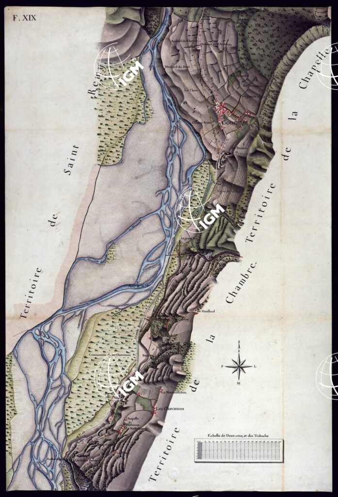 MODELE QUI SERT POUR L’UNION DES FEUILLES, QUI COMPOSENT LA CARTE DE LA GRANDE ROUTE DEPUIS CHAMBERY JUSQU’A S. JEAN DE MAURIENNE LEVEE SUR LIEUX DANS SUR LIEUX DANS ANNES 1781 ET 1782 PAR MARCHETTI INGENIUR TOPOGRAPHE DE S. M. – FOGLIO XIX.
