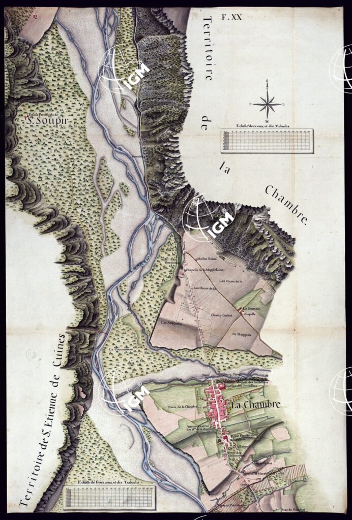 MODELE QUI SERT POUR L’UNION DES FEUILLES, QUI COMPOSENT LA CARTE DE LA GRANDE ROUTE DEPUIS CHAMBERY JUSQU’A S. JEAN DE MAURIENNE LEVEE SUR LIEUX DANS SUR LIEUX DANS ANNES 1781 ET 1782 PAR MARCHETTI INGENIUR TOPOGRAPHE DE S. M. – FOGLIO XX.