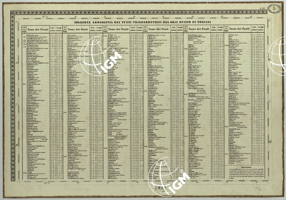 CARTA TOPOGRAFICA DELLO STATO PONTIFICIO E DEL GRAN-DUCATO DI TOSCANA COSTRUTTA SOPRA MISURE ASTRONOMICO TRIGONOMETRICHE ED INCISA SOPRA PIETRA A VIENNA NELL’I.R. ISTITUTO GEOGRAFICO MILITARE – FOGLIO C.12 PUNTI TRIGONOMETRICI