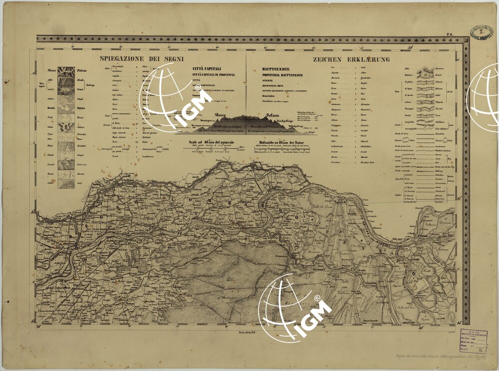 CARTA TOPOGRAFICA DELLO STATO PONTIFICIO E DEL GRAN-DUCATO DI TOSCANA COSTRUTTA SOPRA MISURE ASTRONOMICO TRIGONOMETRICHE ED INCISA SOPRA PIETRA A VIENNA NELL’I.R. ISTITUTO GEOGRAFICO MILITARE – FOGLIO F.6 SEGNI CONVENZIONALI