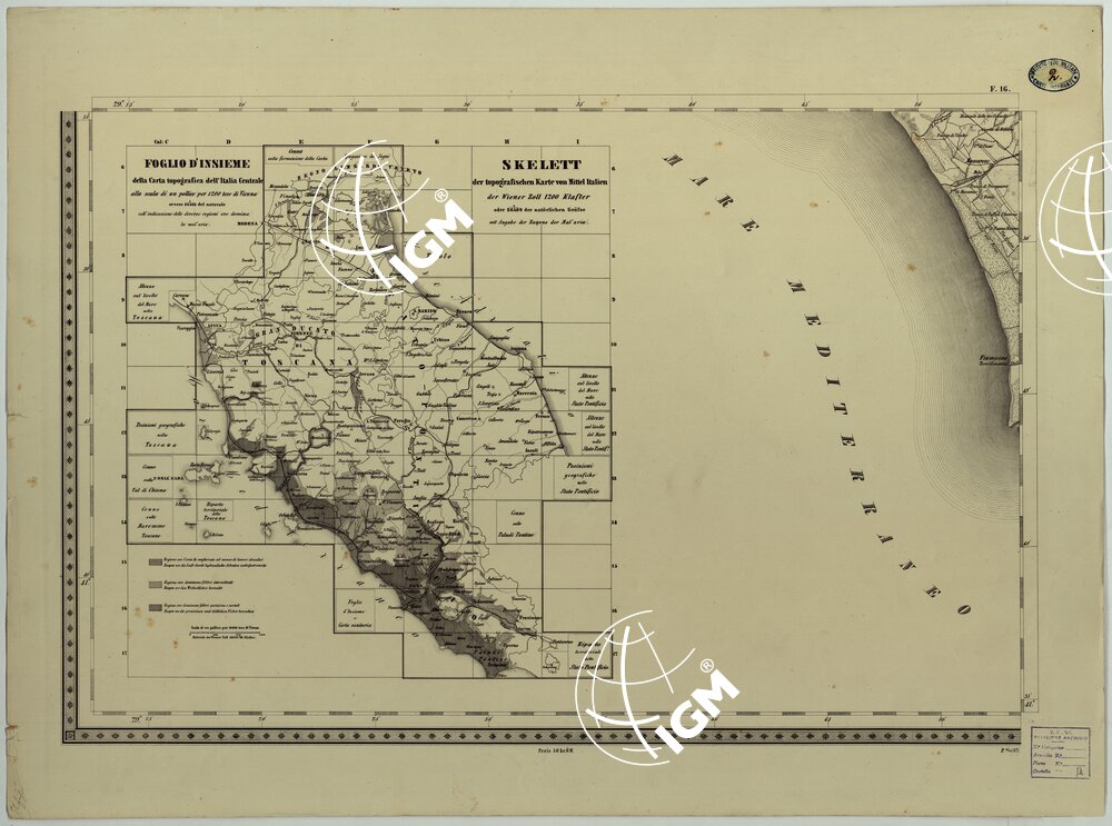 CARTA TOPOGRAFICA DELLO STATO PONTIFICIO E DEL GRAN-DUCATO DI TOSCANA COSTRUTTA SOPRA MISURE ASTRONOMICO TRIGONOMETRICHE ED INCISA SOPRA PIETRA A VIENNA NELL’I.R. ISTITUTO GEOGRAFICO MILITARE – FOGLIO F.16 QUADRO D’UNIONE