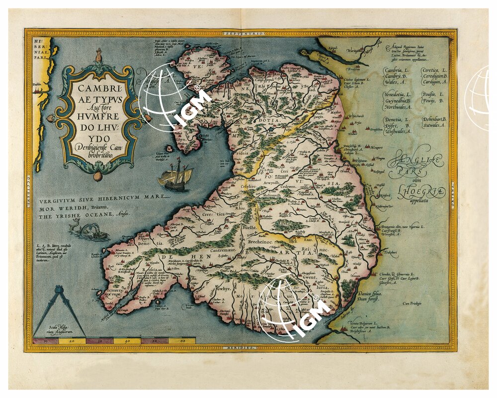 THEATRUM ORBIS TERRARUM (ATLANTE DELL’ ORTELIO) A COLORI – CAMBRIÆ TYPUS AUCTORE HUMFREDO CHUYDO DENBYGIENSE CAMBROBITANO TAVOLA 13