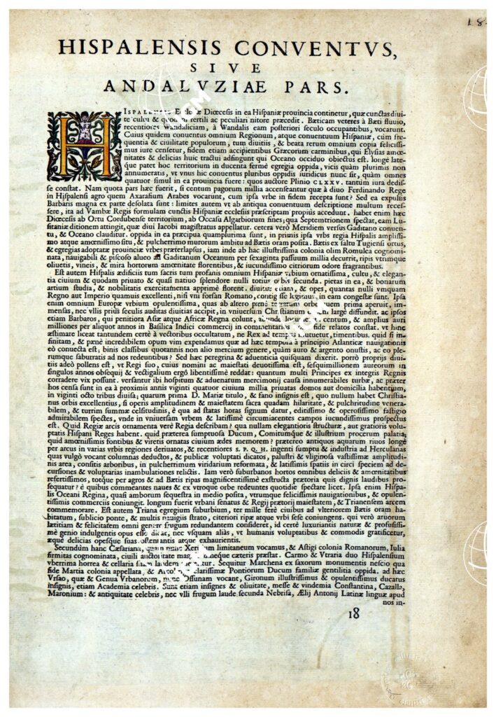 THEATRUM ORBIS TERRARUM (ATLANTE DELL’ ORTELIO) A COLORI – HISPALENSIS CONVENTUS SIVE ANDALUZIÆ PARS TESTO RETRO