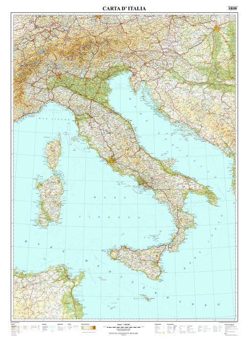 La versione generale rappresenta sia i lineamenti naturali del territorio che i principali insediamenti umani: riporta i principali tematismi dei trasporti (rete viaria principale, ferrovie, porti, aeroporti), dell’idrografia (fino al 4° ordine IGM, laghi e invasi principali, ghiacciai), degli insediamenti (siti archeologici, edifici storici e religioni importati), delle località abitate distinte per abitanti ed importanza amministrativa nonché i confini di Stato e di Regione; l’orografia è rappresentata con tinte ipsometriche, sfumo e punti quota. La versione fisica rappresenta i lineamenti naturali del territorio: riporta più in dettaglio i tematismi dell’idrografia, dei rilievi, delle principali regioni geografiche (massicci e catene montuose, altopiani, valli, pianure, mari, golfi, punte, capi, isole ed arcipelaghi) con la relativa toponomastica, riporta inoltre le località abitate sino ai capoluoghi di Provincia e i confini di Stato; l’orografia è rappresentata con tinte ipsometriche, sfumo e punti quota. La versione politica rappresenta i principali aspetti amministrativi del territorio: riporta i confini di Stato, di Regione e di Provincia, le località abitate principali fino ai capoluoghi di Provincia e fino ai comuni con popolazione superiore a 50.000 abitanti (distinte per importanza amministrativa e per fasce di popolazione), la toponomastica relativa alle unità amministrative e alle principali regioni geografiche e forme naturali del territorio; l’orografia è rappresentata con sfumo.
