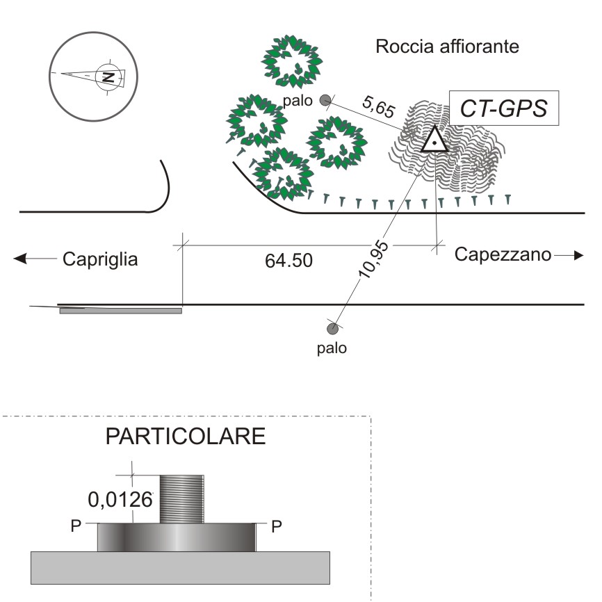 | Materializzazione | Contrassegno autocentrante infisso su roccia affiorante, posta a sinistra della strada in direzione Capezzano Monte. |