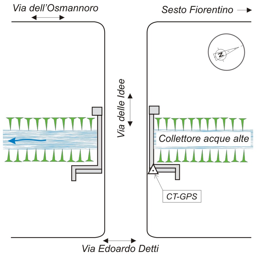 Centrino in acciaio inox di altro ente del tipo GPS, con testa semisferica e foro centrale, recante la scritta "CBAF-Rf05", infisso sulla sommità di un blocco in cemento posto a ridosso della spalletta del ponte del canale situato tra via dell'Osmannoro e via Edoardo Detti, lato monte ed in riva sinistra.