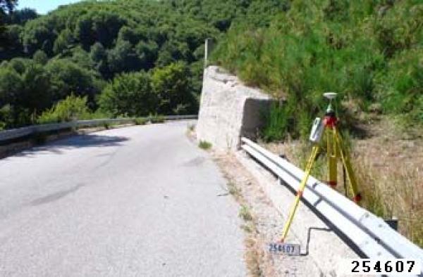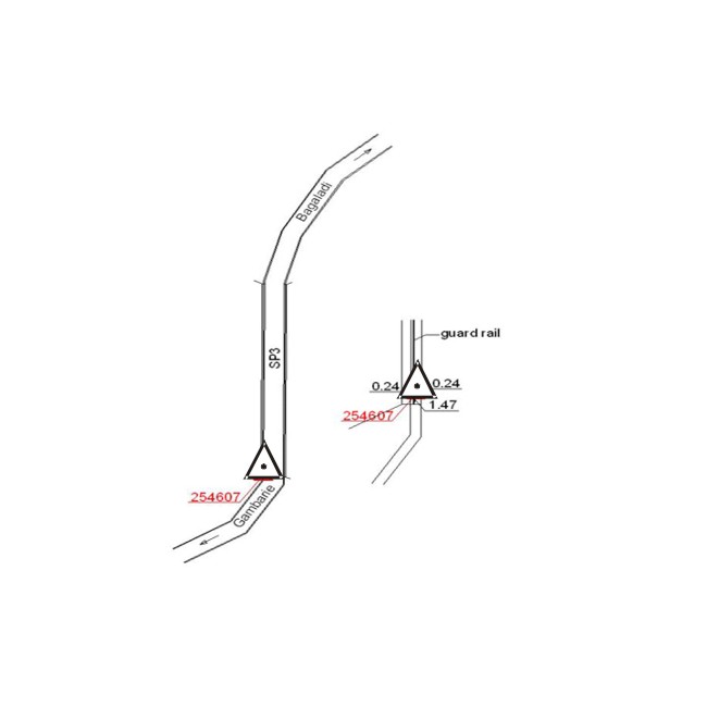 | materializzazione | Centrino metallico infisso su cordolo di cunetta in calcestrusso a bordo strada. |