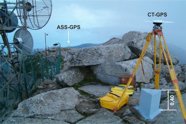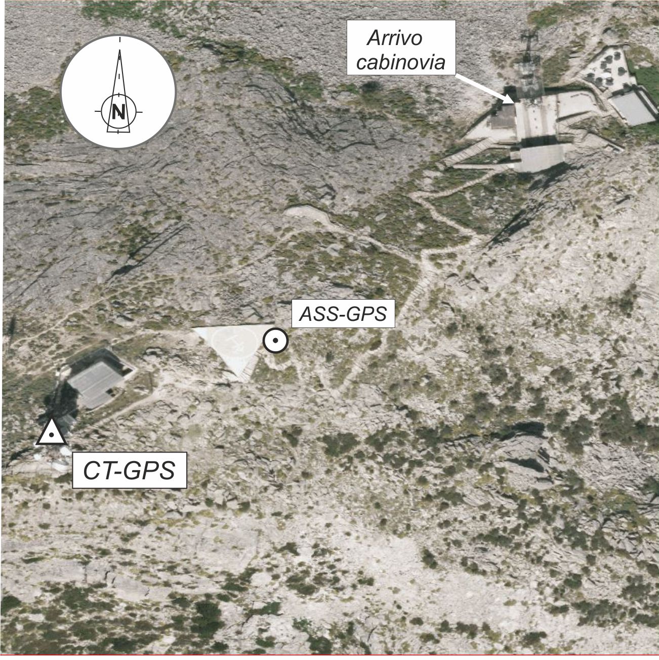 Centrino in acciaio inox del tipo "GPS C" infisso in asse al primo elemento del pilastrino Trombetti di altezza 0,40 m. dal suolo, riempito in cemento e al sottostante centrino di fondo cementato su tubo metallico.