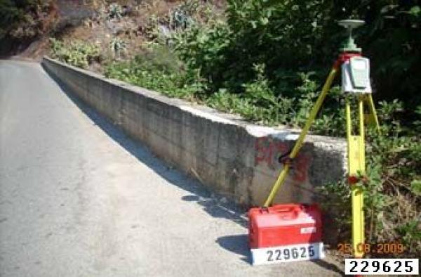 Centrino metallico infisso su testa di parapetto in calcestruzzo a bordo strada.