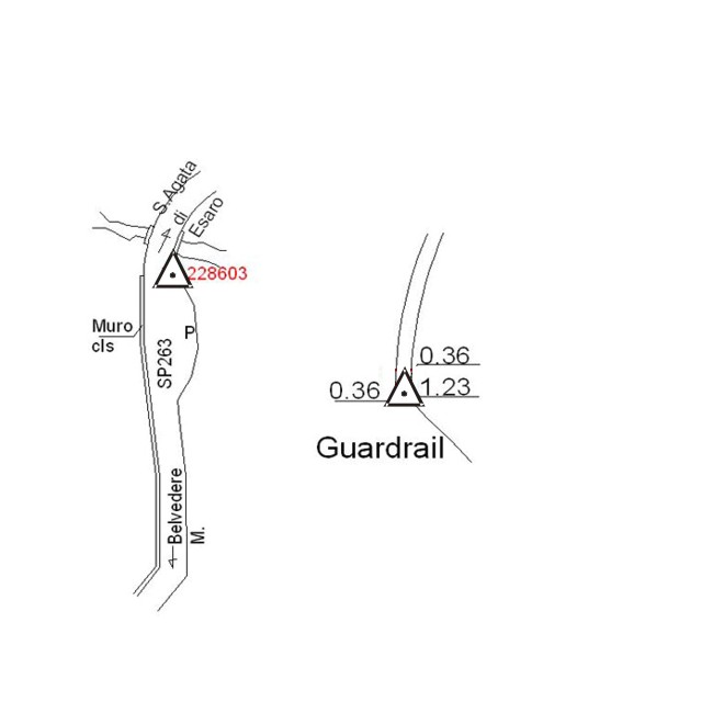 | materializzazione | Centrino metallico infisso su muretto paracarro a bordo strada, su canale di scolo. |