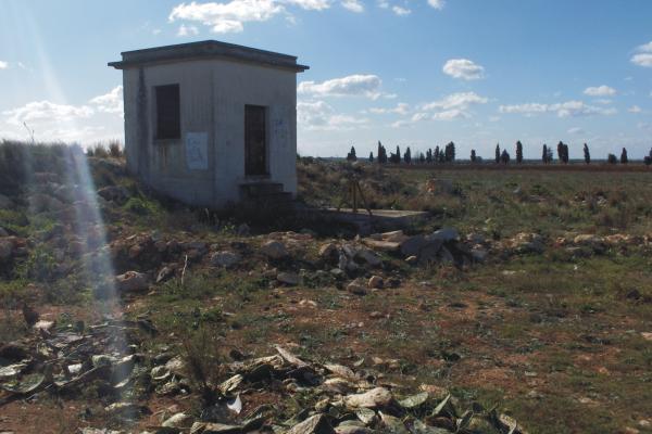 Centrino della Regione Puglia, infisso sulla base in cemento di un casotto in muratura.