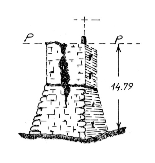 | Materializzazione | Pilastrino sullo spigolo sud-ovest della torre in parte diroccata. Il pilastrino esiste ma è inaccessibile e la torre in rovina. |