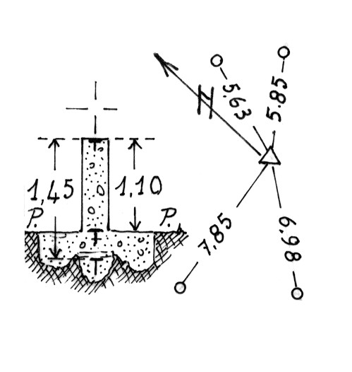 Segnale sulla cima del monte. Pilastrino in calcestruzzo con centrino alla sommità e sottostanti centrini coassiali. Riferimenti: quattro centrini metallici cementati su roccia.