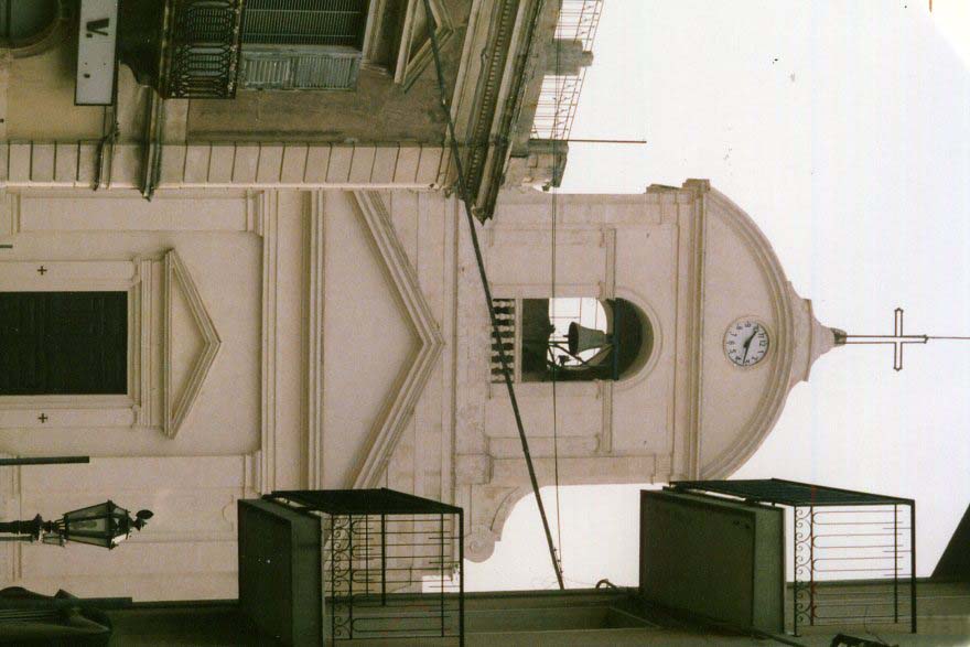 | Materializzazione | Campanile sul frontone della chiesa principale. Asse geometrico del campanile. |