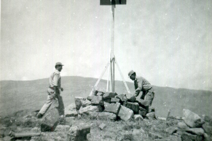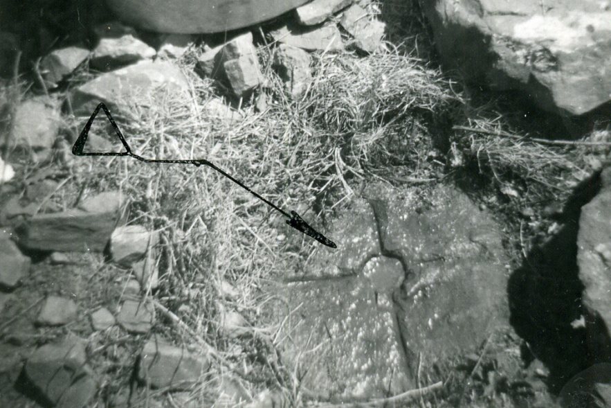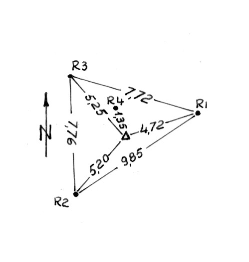 Segnale sulla cima del monte. Croce incisa su pietra. Riferimenti: R1, R2, R3 centrini metallici; R4 centrini tronco-conici in superficie ed in profondità.