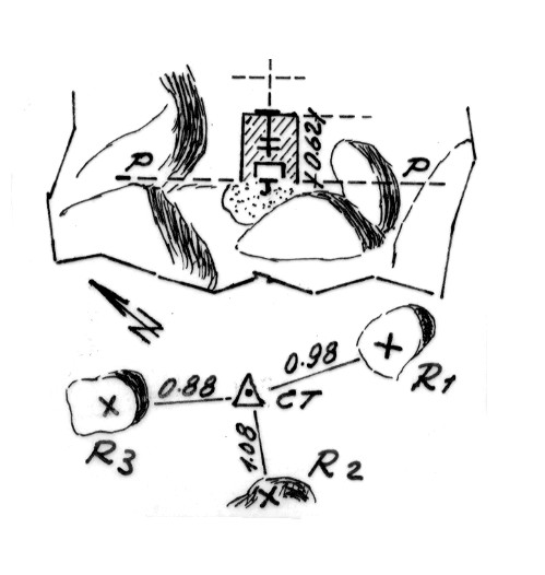 | Materializzazione | Segnale sopra un cocuzzolo formato da grossi massi, ad ovest di Santa Caterina. Centrini di fondo e di superficie in blocco in muratura. Riferimenti: Tre come da pianta. |