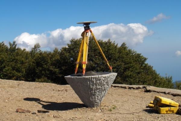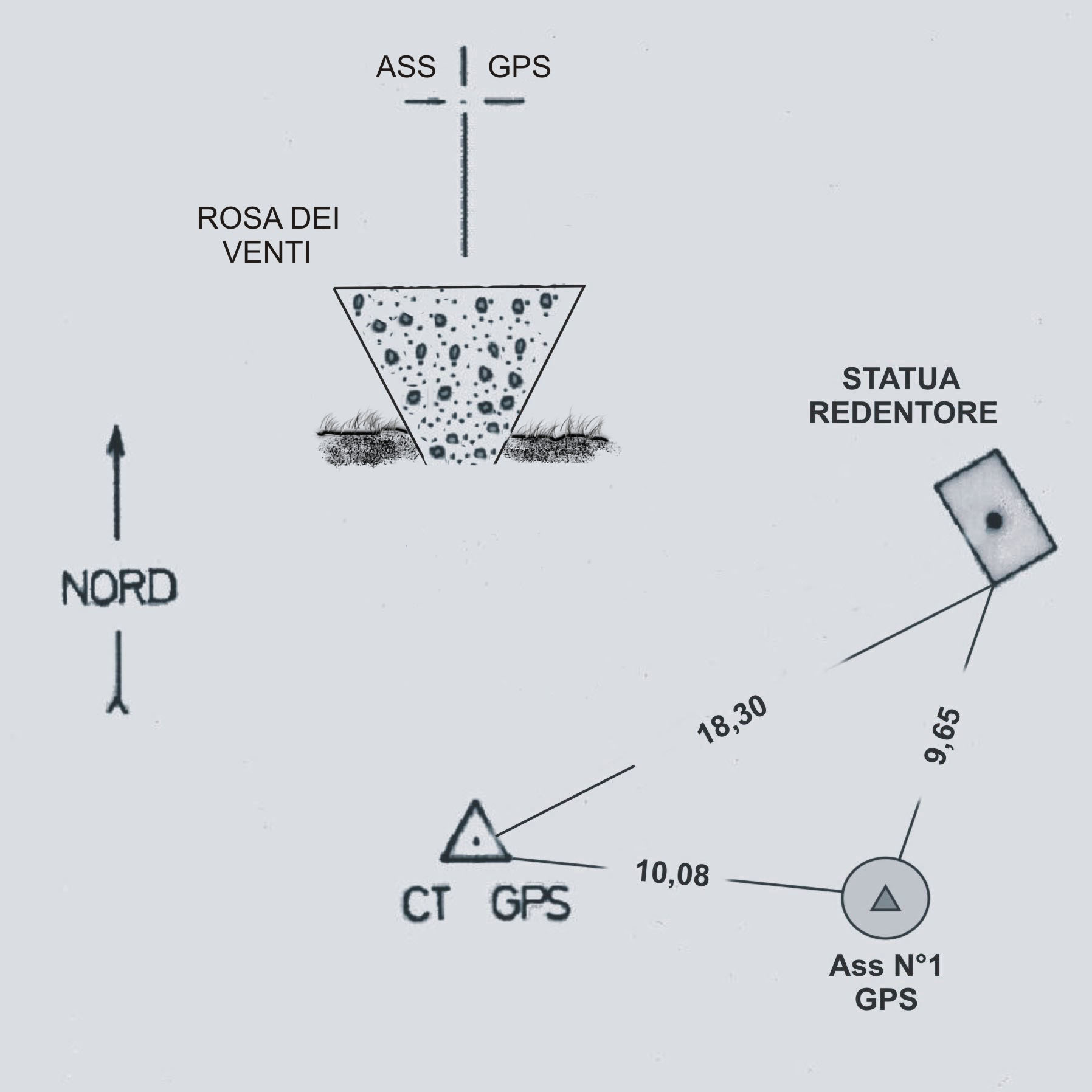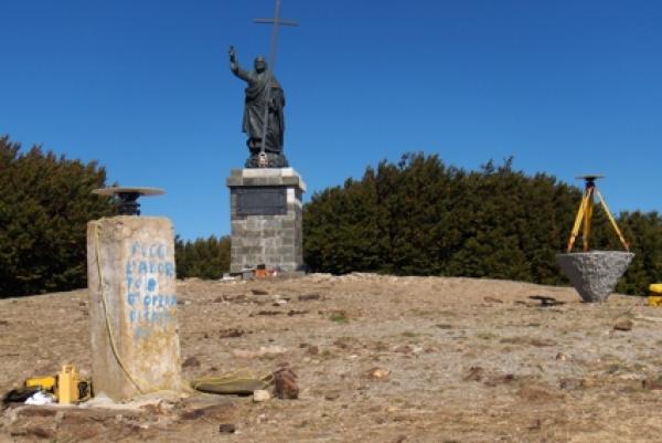 | materializzazione | Centro della "Rosa dei Venti" in metallo, fissata alla sommità di un cono rovescio in pietra collocato sulla cima del monte omonimo, tra la statua del Redentre e il pilastrino IGM, vertice IGM95. |