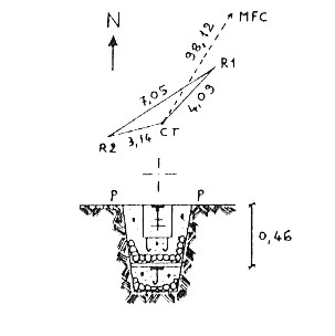 Centrino di profondità sormontato da centrino di superficie coassiale posto in un blocchetto di cemento armato prefabbricato, affogati in 2 gettate di calcestruzzo indipendenti. Riferimenti: 2 centrini metallici,