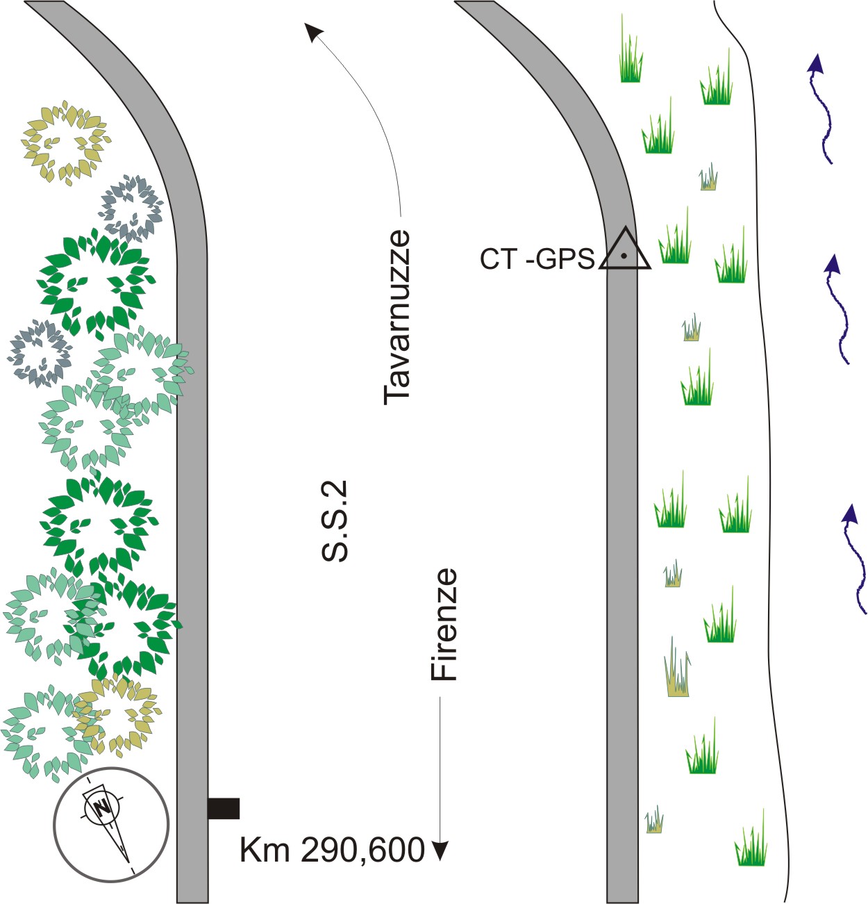 | Materializzazione | Centrino in acciaio inox del tipo GPS universale infisso su di un muretto in cemento alla periferia di Tavarnuzze sito sulla S.S.2 presso il Km 290,600. |