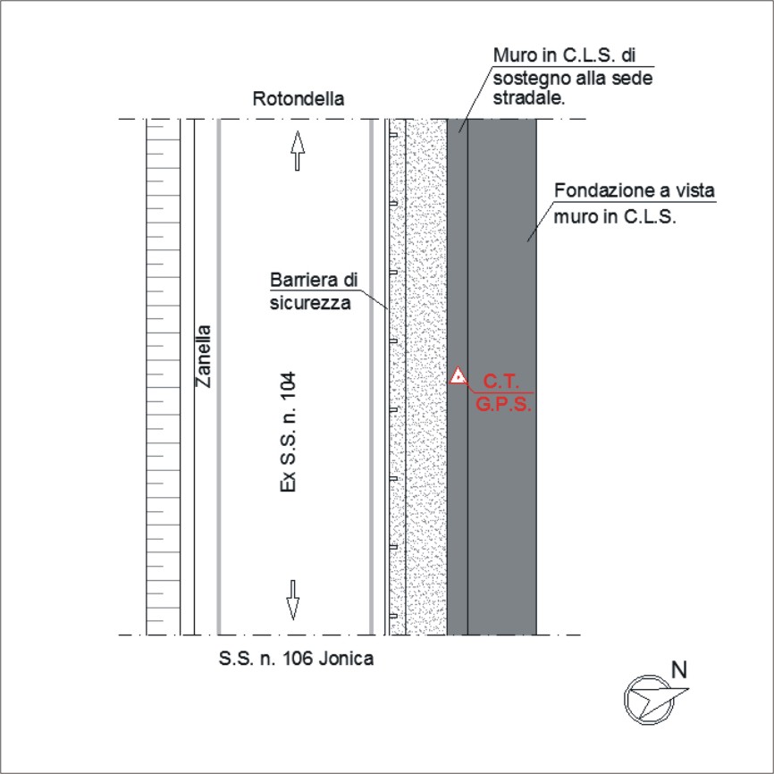| materializzazione | Centrino orizzontale di tipo chiodo con rondella ARPAB Regione Basilicata infisso sulla sommità di un muro di sostegno in C.L.S. alla sede stradale della ex S.S.104. |