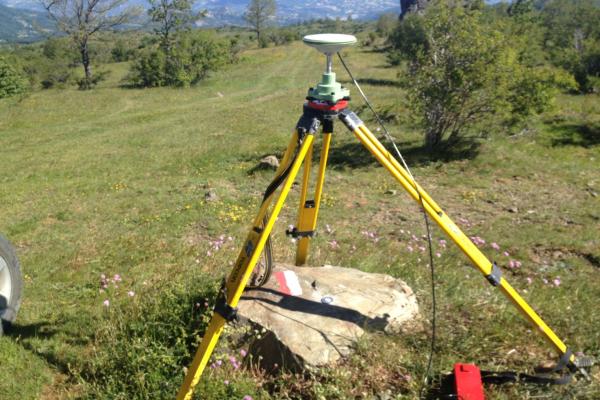 Centrino orizzontale di tipo chiodo con rondella ARPAB Regione Basilicata infisso su un masso affiorante segnalizzato da percorso per trekking.