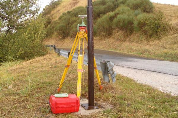 | Materializzazione | Centrino metallico con rondella in ottone infisso sulla base in cemento di un lampione. |