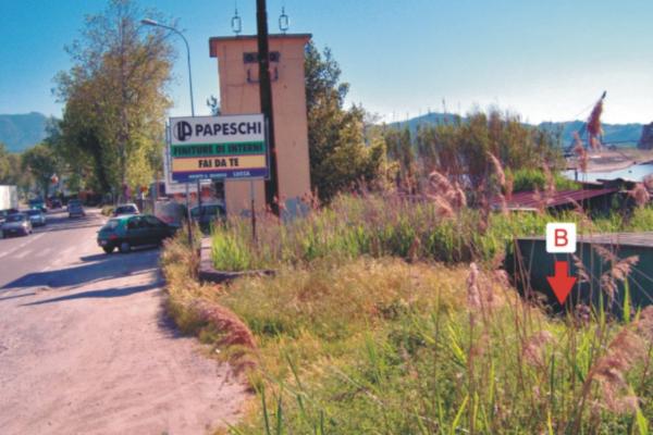 | Materializzazione | Contrassegno del tipo GPS da livellazione infisso sopra piattaforma presso baracca di fronte a un laghetto. |