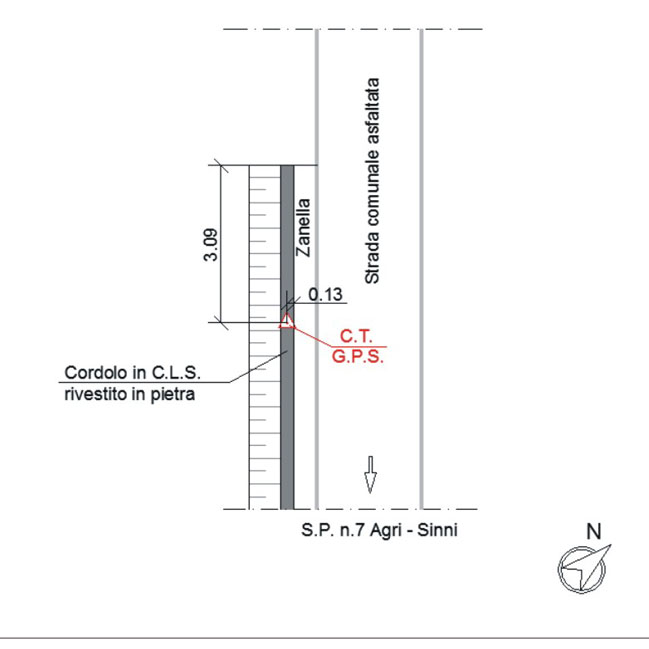 | materializzazione | Centrin metallicoo orizzontale di tipo chiodo con rondella ARPAB Regione Basilicata infisso sul cordolo con zanella in C.L.S. |
