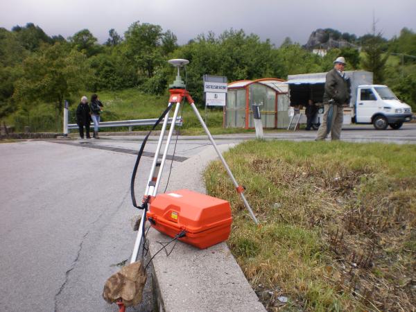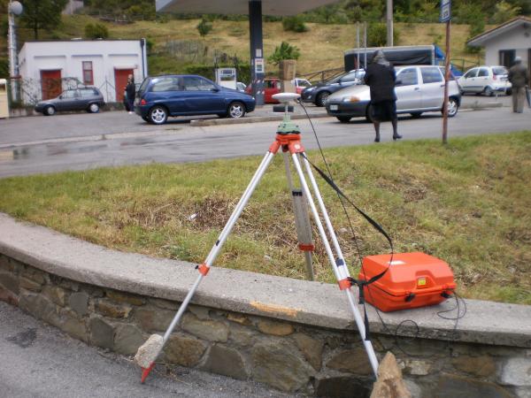 | materializzazione | Centrino metallico orizzontale di tipo chiodo con rondella ARPAB Regione Basilicata infisso sulla sommità di un muro di sostegno in C.L.S. rivestito in pietra. |