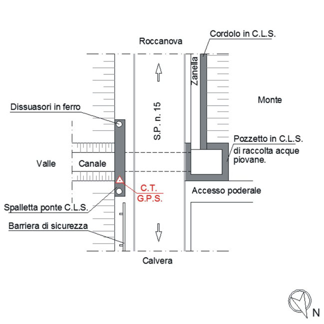 | materializzazione | Disco circolare in ghisa con semisfera di tipo Dipartimento del Territorio Catasto – Punto Fiduciale G.P.S. infisso sulla sommità di una spalletta ponte in C.L.S lato sinistro direzione Càlvera. |