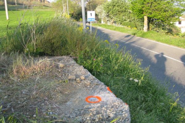 | materializzazione | Centrino metallico orizzontale di tipo chiodo con rondella ARPAB Regione Basilicata infisso sulla sommità di un blocco di cemento. |