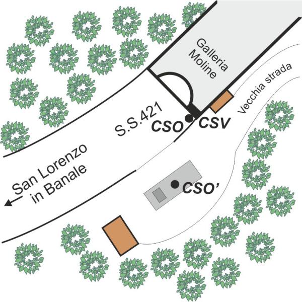 | Contrassegni | [{"simbolo_contrassegno":"B1","materializzazione":"(CSO) – Bullone infisso nella volta della galleria \"Moline\", lato a sinistra in direzione San Lorenzo in Banale."},{"simbolo_contrassegno":"B4","materializzazione":"(CSO') – Centrino universale infisso sul cordolo in cemento, che contorna una struttura, posta sul piazzale dell'entrata sud della galleria \"Moline\"."},{"simbolo_contrassegno":"V6","materializzazione":"(CSV) – Piastrina con cilintretto infissa in corrispondenza del cso."}] |