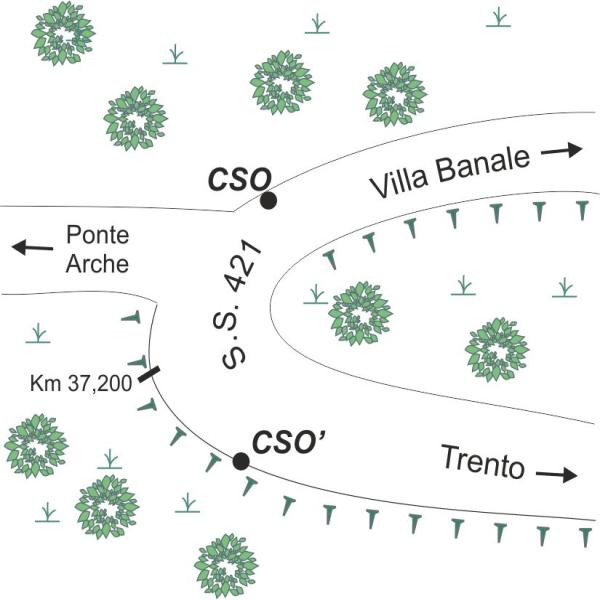 | Contrassegni | [{"simbolo_contrassegno":"B1","materializzazione":"(CSO) – Bullone infisso nel muro di contenimento del tornante della S.S.421, in bozze di pietra, che si trova dopo il bivio per Ponte Arche, lato sinistro direzione Villa Banale."},{"simbolo_contrassegno":"P4","materializzazione":"(CSO') – Centrino in ghisa del Catasto di Trento posto all'interno di un pozzetto protetto da coperchio in ghisa posizionato all'esterno di un tornante, poco prima del Km. 37,200. Il contrassegno coincide con il P.F. n.434 -105."}] |