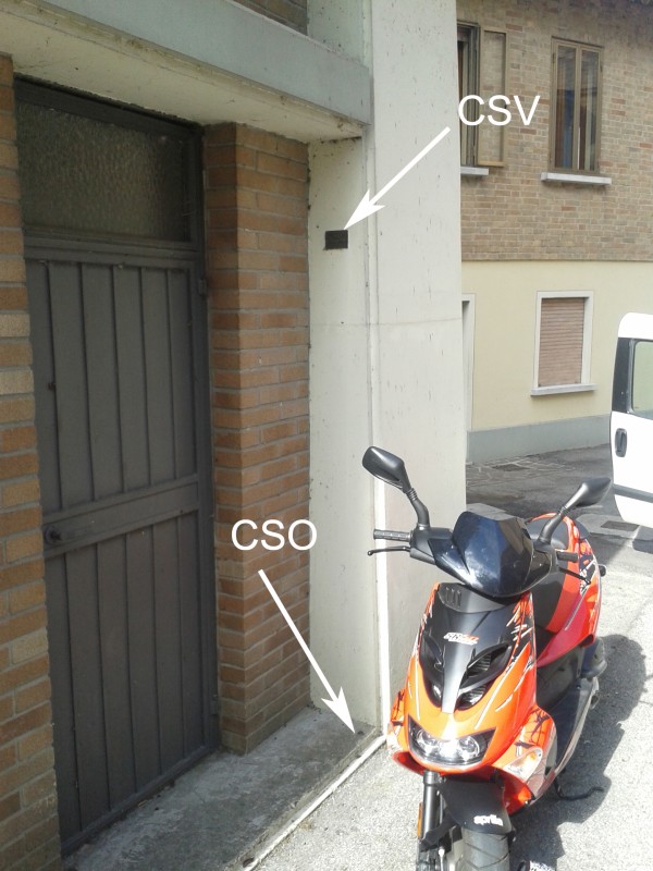 [{"simbolo_contrassegno":"B2","materializzazione":"(CSO) – Chiodo anonimo infisso alla base del campanile, nell'angolo destro della soglia d'ingresso."},{"simbolo_contrassegno":"V4","materializzazione":"(CSV) – Piastrina di altro Ente infissa sullo stipite del vano della porta d'ingresso del campanile, a destra entrando."}]