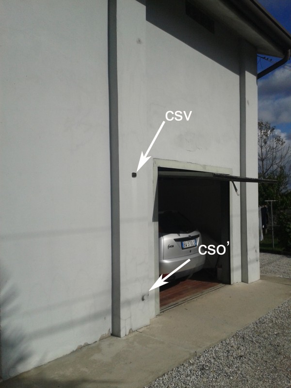 [{"simbolo_contrassegno":"P5","materializzazione":"(CSO) – Contrassegno, protetto da tubo in PVC e coperchio di ghisa, interrato sul ciglio della strada, a destra della discesa Est, a 0,80 m dal 1\u00b0 montante del guard-rail."},{"simbolo_contrassegno":"B1","materializzazione":"(CSO') – Bullone infisso sul pilastro centrale del magazzino attrezzi, parete prospiciente la strada."},{"simbolo_contrassegno":"V4","materializzazione":"(CSV) – Piastrina di altro Ente infissa sul pilastro suddetto, in corrispondenza del CSO'."}]