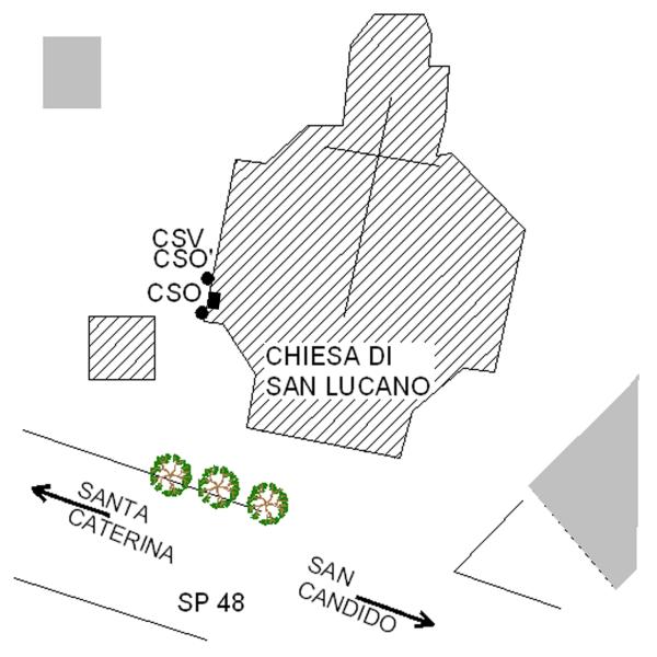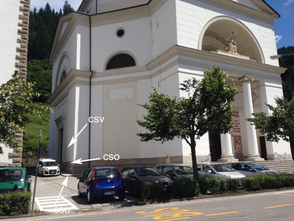 [{"simbolo_contrassegno":"B1","materializzazione":"(CSO) – Bullone infisso sul fianco sinistro della chiesa, in prossimit\u00e0 della porta laterale-"},{"simbolo_contrassegno":"B2","materializzazione":"(CSO') – Borchia RV 116 infissa sul marciapiede in marmo, in prossimit\u00e0 del CSO."},{"simbolo_contrassegno":"V4","materializzazione":"(CSV) – Piastrina RV 116 infissa sulla facciata laterale, in corrispondenza del CSO."}]