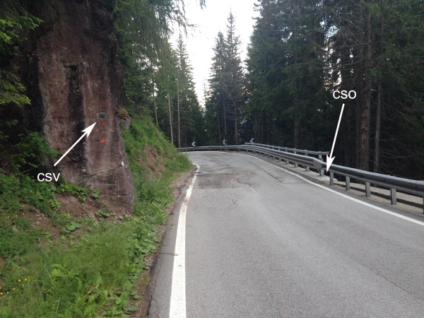 [{"simbolo_contrassegno":"B2","materializzazione":"(CSO) – Borchia infissa sulla sommit\u00e0 dell'inizio del nuovo muro di sostegno, a valle della strada."},{"simbolo_contrassegno":"V6","materializzazione":"(CSV) – Piastrina con cilindretto infissa quasi di fronte al CSO, su roccia in posto, a monte della strada-"}]